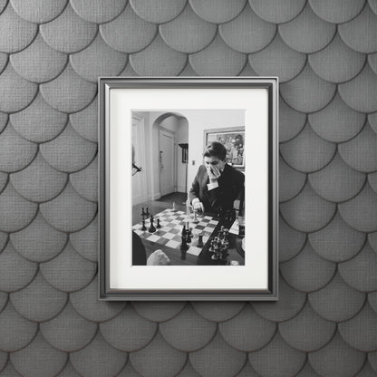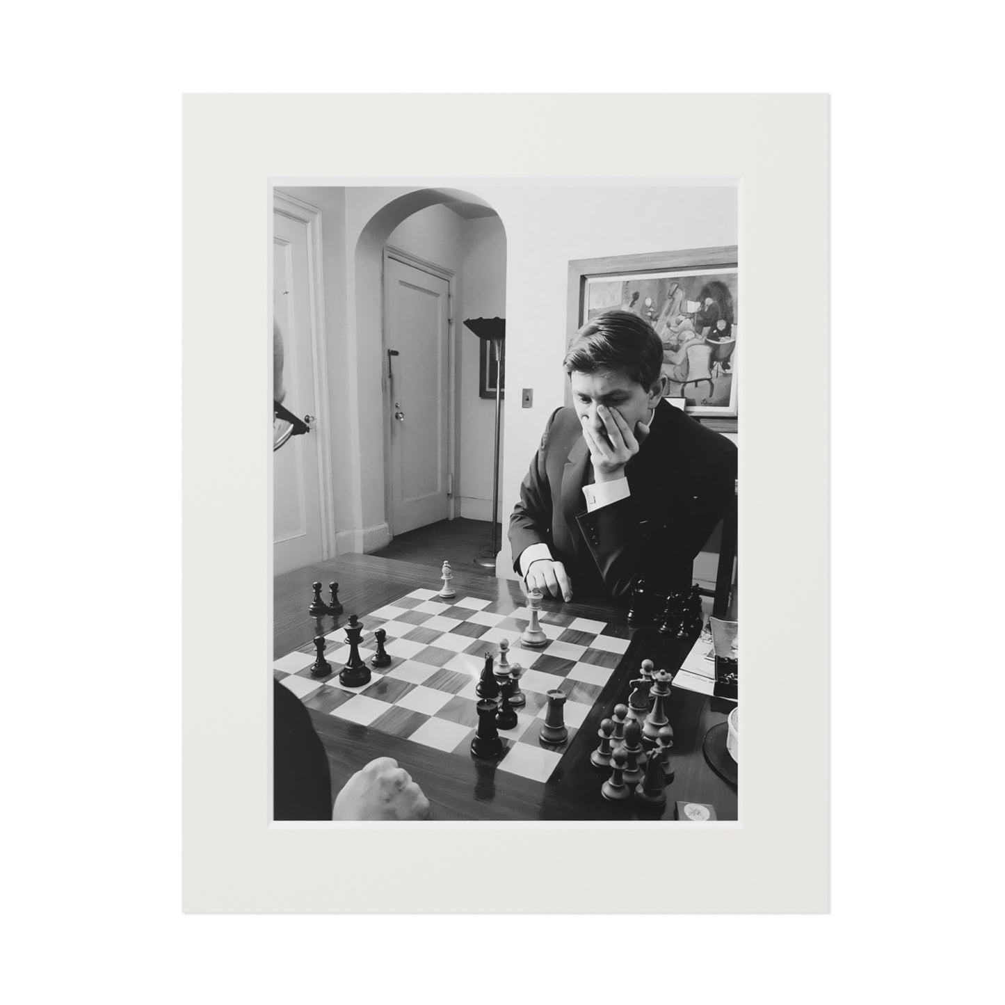 Create a sophisticated and artistic atmosphere in your home with these Bobby Fischer Chess Grandmaster Prints. Perfect for chess enthusiasts and art lovers alike, these prints are available in two sizes to suit your space. Ideal for decorating your home office, game room, or study. Perfect gift for chess players and fans, suitable for birthdays, Christmas, Father's Day, and other special occasions. Product features - Mountboard window frame with a 2mm thick cut for premium presentation - Giclée print with bright and intense colors that won't fade - 175gsm fine art paper for quality imagery - Available in 11"×14" or 16"×20" sizes - Natural white frame color adds a touch of elegance Care instructions - Wipe the dust off gently with a soft, dry cloth.